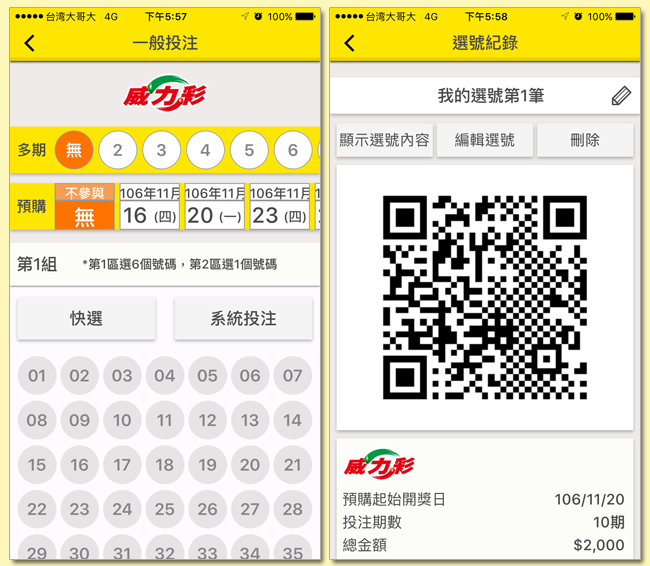 注意事項:彩券銷售後如遇有加開期數之情況,預購及多期投注之期數將順延。若彩券上的資料和電腦紀錄的資料不同,以電腦紀錄資料為準。